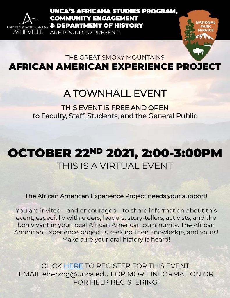 Fall 2021 – The Great Smoky Mountains African American Experience Project TownhallA recording of the event can be viewed HERE as soon as possible.