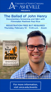 Africana Studies and History presentThe Ballad of John Henry: Documentary Screening and Q&A with Filmmaker Matthew Paul Rice. Register via Zoom, February 10th, 2022 from 11:45am-1:15pm