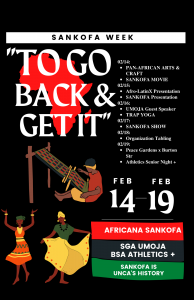 Sankofa Week: Sankofa Movie Screening. The Grotto, Highsmith, February 14th, 2022 from 5:00pm-7:00pm in participation with Sankofa, SGA, BSA, Umoja, Athletics.